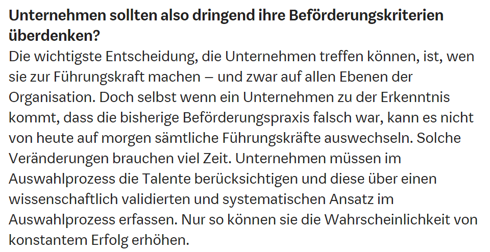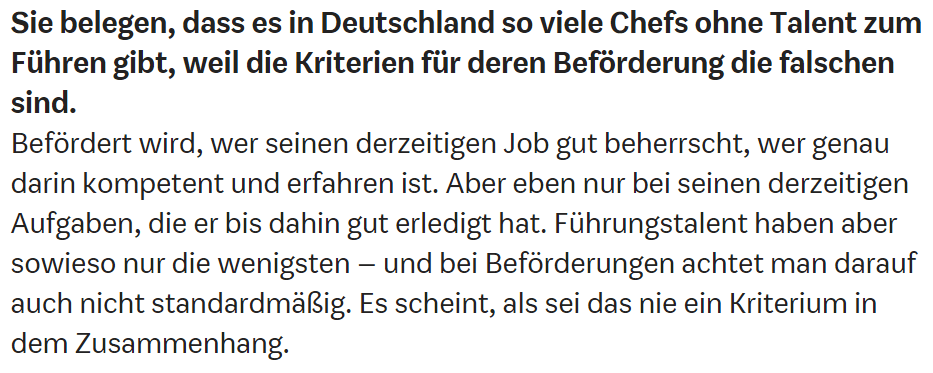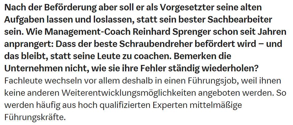 I just found an interesting article in “Wirtschaftswoche” a German weekly magazine (just a side note: my employer about 30 years ago). Here is the link to the article Wenn aus qualifizierten Experten mittelmäßige Führungskräfte werden. I will insert screenshots of German paragraphs and explain them in English.